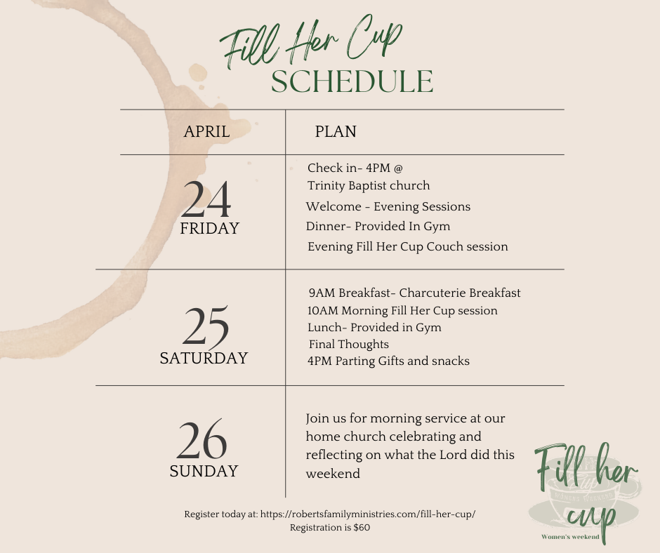 - April 24-25: Ladies’ Conference “Fill Her Cup” — Friday evening and Saturday sessions.